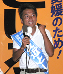 出馬表明したのは今年2月。「愛媛維新」を合言葉に、民主党、社民党、国民新党の推薦を受け、愛媛20市町村キャラバンを実施し、県内をくまなく回った。年金問題や政治とカネをまつわる問題で全国的に野党候補に追い風が吹く中、サッカーボール大のチラシや10万人握手キャンペーンなどを実施。無党派層をうまく取り込んで、閣僚経験のある前職を破り、保守王国に新風を吹かせた。