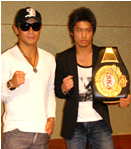 (写真:ミドル級王者魔裟斗(左)と上松)「スピードとテクニックが魅力です。日本人の層が最も厚く、面白い階級」
