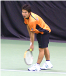 (写真:2年目にしてシングルス戦に抜擢された小川選手) まずはシングルスNo.2の小川冬樹選手が挑んだ。第1セット、徐々に小川選手の動きがよくなっていく。ゲームカウント1−2で迎えたサービスゲーム、ダブルフォルトで40−40と並ばれると、そこから激しいポイントの奪い合いとなった。この試合1本目のサービスエースでようやくアドバンテージを取った小川選手は相手のリターンが浅く入ったところをボレーで決め、このゲームをなんとか奪った。
