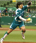 (写真:好リリーフを演じた西村投手) もう一人の新人、西村瑞紀投手も勝利の立役者の一人だ。先発のエース坂田那己子投手が好投しながらも守備のミスもあって、4回途中まで2失点を喫した。そこで指揮官は新人の西村投手を2番手に送る。バックにも助けられ、西村投手はランナーを出しながらも5回まで無失点。上々の滑り出しだった。