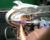 それまで主流とされていた研磨装置(写真2)は回転している円盤形の研磨石にブレードをあてて研ぐ方式だった。しかし、坂田がドイツ式の模型図を見て、開発した研磨装置は、垂直に回転させた円錐台の研磨石にブレードをあてて研ぐ「バーティカル型」(写真3)だ。これにより、円盤では不可能だったトゥピックに当たるエッジの最先端部分(写真4)まで均一で滑らかに研ぐことができるようになったのだ。このことが、選手のパフォーマンス向上に大きく影響している。