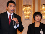 その後は出席した各アスリートが壇上に上がり、今年の抱負をそれぞれ披露。オークションやお楽しみ抽選会では中矢選手の柔道着をはじめ、各アスリートから競技用のジャージやグッズが出品された。最後は毎年恒例となった大亀会長とのじゃんけん大会が繰り広げられ、優勝者には花鉢が贈られた。なお、オークションの売上は国体選手の強化費に充てられる。