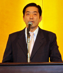 (写真:「スポーツで“愛顔(えがお)”あふれる愛媛づくりを」と呼びかける中村知事)