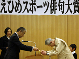 2012年度「えひめスポーツ俳句大賞」の表彰式が3月23日、松山市内で開かれた。この賞は同市出身の俳人で野球好きとしても知られた正岡子規の野球殿堂入りを契機に、「スポーツに接して得られる感動やときめき、共感を俳句に詠み込むことにより、スポーツファンの増加と、スポーツと文化が融合した新しい芸術文化の創造」を目指して設けられ、今回で11回目を迎えた。