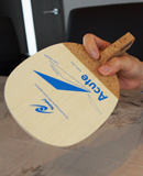 (写真:ほとんどのトップ選手が使用している「シェークハンドラケット」) 現在、世界の卓球界で主流となっているのがグリップを握手するように握る「シェークハンドラケット」(写真)だ。ラケットの両面にラバーを貼り、フォアハンドとバックハンドとでは使用する面が異なる。一方、これまで古くから日本で一般的に用いられてきたのが、ペンを持つようにグリップを握る「日本式ペンラケット」(写真)だ。これは片面だけにラバーを貼り、同じ面でフォアとバックを打つ。