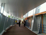 (写真:ゴール裏スタンドのコンコース) 夕日が差し込んでも視認性が良い大型電光掲示板も素晴らしい。試合前の会場を盛り上げる演出にも使われているし、スポンサーバナーの表示により、広告効果も見込まれる。試合中には、リプレー映像が流され、会場全体で各局面の詳細が確認できるようになった。