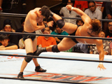 王者同士の死闘 今月19日には、PRO-WRESTLING NOAH(ノア)のリングに初参戦した。東京・ディファ有明でのグローバルリーグ開幕戦で、前年度の覇者で現GHCヘビー級王者のKENTAと戦った。大日本のエースとノアのエースの対決は、リーグ戦の優勝を占う一戦として注目度も高く、観衆は超満員の1600人を集めた。