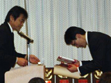 (写真:入賞者を表彰する愛媛県体協・大亀会長<左>) 前回の2012年度は全国41都道府県から4,333句の応募があったが、今回は1人あたりの投句数を5つまでに制限したため、応募句数自体は3002句と減少した。その一方で史上最多となる全国44都道府県から、1550名がスポーツを題材にした五・七・五を寄せ、「スポーツ俳句という文化が徐々にではあるが、愛媛ブランドとして全国に浸透してきた」(愛媛県体育協会・大亀孝裕会長)と言える結果になった。集まった作品の中から4人の審査員の選考により、各部門で大賞が決定した。