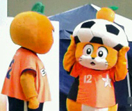 イベントが開始されると、表彰式に先立ち、愛媛FCマスコットキャラクターの「オ〜レくん」がステージに現れる。すると、司会者が「オ〜レくんが紹介したい人がいる」と解説。オ〜レくんが舞台袖に向かって手招きすると、オレンジ色のかわいらしいキャラクターが手を振りながら登場! 県サッカー協会の新キャラクター「ひめ太くん」である。