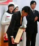 ひめ太くんのお披露目が終了した後、優秀選手の表彰が始まった。国体成年男子の表彰では、FC今治の所属選手として活躍しているGK山崎史登選手とDF植村公亮選手、FW岡本剛史選手が壇上にのぼり、メダルと表彰状を受け取っていた。岡本選手は、この後の第1種部門でも表彰され、うれしいダブル受賞となった。その岡本選手は「今年はJFLに上がれるようにチーム一丸となって頑張りたいと思いますので、FC今治の応援をお願いします!」とコメントした。