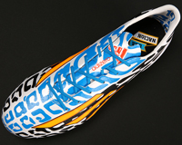 まず、デザインから他のモデルとは一線を画す。メインの白黒のグラフィックに加え、アルゼンチンのカラーであるブルーがあしらわれている。さらに「シンプルでフィッティング重視の構造を」との本人のこだわりで、一枚皮の「ハイブリッドシンセティックレザー」を採用。縫い目がないアッパーでメッシの足を包み込む。