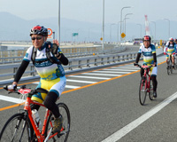 (写真:サイクリングしまなみでもサイクリングクラブの会員が揃いのユニホームで橋上を走った) 門田選手は「今回のイベントが第一歩。継続して開催することで、しまなみ海道が本当に聖地になる」と訴える。島を渡る船との連携や、沿道のグルメとのコラボ、松山・道後温泉などの観光スポットへの誘引といった広がりを持たせれば、「まだまだ人を呼べるポテンシャルがある」と門田選手は信じている。既にしまなみ海道から四国全体を自転車で巡るパッケージも企画し、海外からも関心を集めているという。