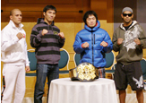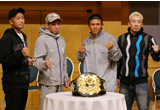 (写真:ミドル級GPに出場する4選手。(左から)バハドゥルザダ、佐々木、中村、サンチアゴ) 会見に姿を現した中村は、目がくぼみ、頬がこけて、かなり減量に苦しんだ様子だった。これまでPRIDE、UFCでヘビー級として戦ってきたため、ミドル(83キロ)での試合の負担は計り知れない。それでもグランプリ初戦となった第五陣では、スピードとキレのある打撃でポール・カフーン(ゴールデン・グローリーUK)を圧倒し、4強にコマを進めた。明日に迫った佐々木戦に向けて、「今持っている情熱をできるだけ多くの人に伝えられる試合がしたい。佐々木選手がいることで自分の強さが表現できると思う」と力強く語った。この日のために磨いてきた右フックを武器に、産まれたばかりの愛娘に勝利を捧げたいところだ。