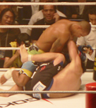 (写真:パウンドで中村を葬ったサンチアゴ)「思っていた通りの展開になった。中村の顔が疲れていたのでいけると思った」と喜んだサンチアゴ。しかし、「なぜベルトがもらえないのか理解できない」と不満も口にした。ミドル級のベルトを巻くには三崎和雄(GRABAKA)とのタイトルマッチに勝利しなければならない。三崎戦については、「ずっと三崎と試合したいと思っていた。今夜にでも戦える」と余裕の発言。戦極4戦連続KO・一本勝ちと波に乗るブラジル人は三崎をも飲み込んでしまうのか。