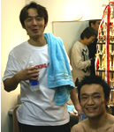 (写真:試合後の控室、笑顔の葛西トレーナー(左)と西岡)