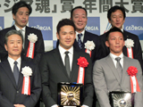 (写真:年間大賞の田中(前列中央)、選考委員特別賞の嶋(前列右)ら) 今季、沢村賞をはじめとする投手部門のタイトルを総ナメした右腕にまた新たな賞が加わった。年間大賞に輝いた田中のピッチングは斎藤佑樹投手とのプロ初の投げ合いでみせたもの。初回、2回を三者凡退に抑えると、中盤以降は走者を背負いながらもタイムリーを許さなかった。完封こそ逃したものの12奪三振の完投勝利。チームの連敗を止めただけでなく、中継ぎ陣を休ませる意味でも価値ある1勝だった。「プロの先輩として死ぬ気で行った」という田中は「野球ファンが望んでいた試合が、ファンの人の記憶に残る試合になって良かった」と喜びを語った。