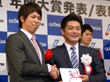 (写真:前田健にもジョージアの缶コーヒー1年分と賞金30万円が贈られた)