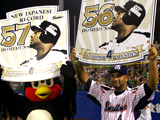 一気に57号まで到達し、残りは18試合。今後は、どこまで数字が伸びるかに引き続き注目が集まる。ここまでは出場113試合で57本と2試合に1本ペースで、計算上は66本となる。ホームランに加え、打率も.338でトップ。120打点でトニ・ブランコ(横浜DeNA)を5点差で追う。チームは最下位でクライマックスシリーズ進出は絶望的ながら、セ・リーグではバース以来となる27年ぶりの三冠王も射程圏内だ。