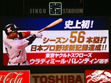 東京ヤクルトのウラディミール・バレンティンが15日、神宮球場での阪神戦で今季56号ホームランを放ち、シーズン日本記録を更新した。1回の第1打席、阪神先発・榎田大樹のストレートをセンターバックスクリーン左へ運んだ。これまでの日本記録は王貞治(巨人、1964年)、タフィ・ローズ(大阪近鉄、01年)、アレックス・カブレラ(西武、02年)がマークした55本。バレンティンは3回の第2打席でもレフトポール際にホームランを放ち、57号に数字を伸ばした。来日3年目の29歳が49年ぶりに記録を塗り替え、前人未踏の領域に突入した。