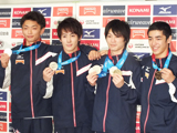 (写真:体操NIPPONのメダリストたち<左から亀山、加藤、内村、白井>)(文・写真/杉浦泰介)