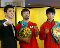 (写真:プロ5戦目となる村田(左)、ライトフライ級王者・井上(右)も揃い踏み)「日本ボクシング史に残る最強の挑戦者」
