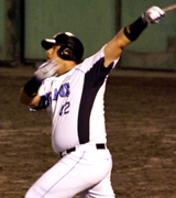 (写真:4回、2試合連続となるダメ押しの一発を放った主砲・カラバイヨ) 与四死球は群馬11個、徳島9個。荒れた試合はミスに乗じた群馬が大差をつけて、星を五分に戻した。