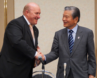 (写真:会見終了後、笑顔で握手を交わすヴァイス氏と川淵チェアマン) 新リーグの輪郭が見えてきた。トップリーグ(1部、2部)と地域リーグの3部構成。川淵チェアマンは「長い目で見て、ホームアリーナがあるからこそ、多くのファンがそこに集い、応援することにつながる。8割プレーするホームアリーナは絶対必要」と、トップリーグは年間ホーム試合の8割を実施できるホームアリーナを義務付けた。その収容人数は1部(12〜16チーム)は5000人収容、2部(16〜24チーム)は3000人を目処とする。