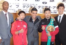(写真:5月1日の試合に臨む王者の三浦(右から2人目)、村田、八重樫ら) 内山vs.三浦――日本人同士の王座統一戦実現へ互いに負けられない一戦だ。