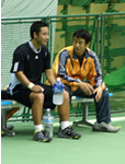 (写真:コート内外でチームを引っ張った日下部キャプテン) まずは好調の植木選手がシングルス戦に挑み、プロの久松亮太選手に6−4、6−2とストレート勝ちを収めた。続いて日下部選手も第1セットを6−3で奪い、伊予銀行勝利まであと1セットとなった。しかし、日下部選手は第2セットを1−6で奪われると、第3セットも3−6で落とし、逆転負けを喫した。