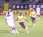 (写真:愛媛がサイドからチャンスメイク) 後半38分、愛媛は相手陣内にて細かくパスをつなぎつつ、攻め上がる。中央でボールをキープしたMF宮原裕司選手が、左サイドでフリーとなっているMF青野大介選手へパス。ボールを受けた青野選手の左足から、ゴール前に向けて絶妙のアーリークロスが供給される。ペナルティエリア内に陣取る江後選手が、このボールを捉え、ジャンピングヘッドでゴールを狙うが、クロスバーのわずか上を越えて、惜しくも得点にはならなかった。