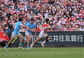 17分に田村のPGで加点したジャパンは、そこからしばらくスコアできない時間が続いた。35分にはウルグアイにPGを返された。このまま1トライ差で試合を折り返すと思われたが、40分にNo.8テビタ・タタフが魅せた。右ラインアウトから小川のパスを受けると、中央突破を図った。