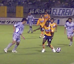 (写真:お互いに闘志をぶつけあうゲームとなった) 後半の立ち上がり、愛媛FCは細かいパスワークで中央突破を図る。FWの動きも活発になってきた。後半5分には、ついに同点ゴールが生まれる。センターライン付近で相手のボールを奪い、中央をドリブルで駆け上がった大山選手が相手DFを引き付けつつ、右サイドのスペースに走り込む内村選手にパス。ボールを受けた内村選手が、ペナルティエリアの外からグラウンダーのクロスを折り返す。