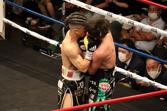 その後は、田中の一方的な展開となった。ボディーに顔面に、左右の多彩なコンビネーションを打ち込むと、橋詰の顔は見る見るうちに紅潮していく。4ラウンド中盤、橋詰は助けを求めるように、頭上の電光掲示板に表示された残り時間に目をやった。