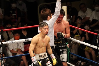 決着の瞬間は、5ラウンドに訪れた。残り1分、田中のパンチで眉をカットした橋詰がドクターチェックを受けた後だった。田中は的確な攻撃で、相手をコーナーに追い詰めると、猛ラッシュ。“勝負あり”と判断したレフェリーが右手を上げ、試合を止めた。