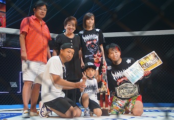 (写真:試合後は家族がリングに上がり、記念撮影)