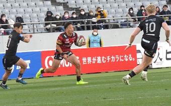 自陣からマイボールスクラムから左に展開し、ハーフウェイライン付近までボールを運ぶ。中央にパスをつなぐとSOアイザック・ルーカスがBL東京守備陣のギャップを突いた。インゴール前で2対2の状況をつくり、フォローに走る南を囮に使って1人でゴールポスト下に飛び込んだ。ルーカスはコンバージョンキックも決め、7対17と10点差に迫った。