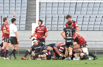 嫌な流れを断ち切ったのは得意の肉弾戦だ。14分、左ラインアウトモールから雪崩れ込み、水際で耐えていたBR東京のディフェンスだったが、No.8ネイサン・ヒューズにオフサイドポジションからボールを持つHO橋本大吾が阻止された。久保修平レフリーはBL東京にペナルティートライ(7点)を与え、ヒューズにイエローカードを提示した。