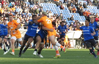 重戦車のようなFWを擁し、リーグ最多得点&最多トライのS船橋・東京ベイにゴールラインまで迫られながらもノートライに抑えたように埼玉WKのディフェンスは堅かった。リーグ最少失点の安定感。7分、自陣右サイドをFL末永健雄に狙われたが、CTBディラン・ライリーが好タックルでトライを防いだ。青い壁は分厚く、ブレイクダウンにもすぐ絡んでいく。
