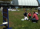 航空公園内はフリーマーケット店でびっしり埋め尽くされていますが、航空発祥記念館という大きな建物の前に200メートルトラックがひとつ入るくらいの芝生広場があります。(写真:小さな女の子もストラックアウトに挑戦!)