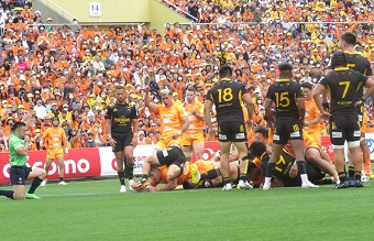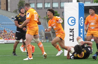 北川のシンビンが解けた後も東京SGは奮闘する。30分、敵陣でペナルティーを獲得すると、FB松島幸太朗がタップキックでリスタート。左サイドに空いたスペースに蹴り込んだ。そのボールにWTBテビタ・リーが追いつき、インゴール左隅にグラウンディング。クルーデンが角度のないコンバージョンキックを成功し、10-7と再びリードを奪った。