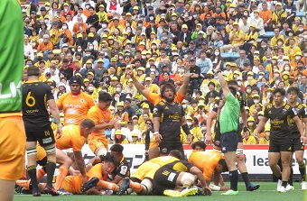ここから東京SGが猛反撃を見せる。40分、クルーデンのトライで18-24。1トライ1ゴールで逆転できる点差まで迫った。ラストワンプレーからアタックを継続。WTB尾﨑泰雅がインゴール左にトライをあげ、1点差に。しかし、TMO(ビデオ判定)の末、トライに至るまでのプレーでスローフォワードがあったと判定され、トライは取り消しになる。