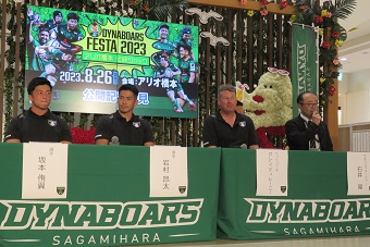 ラグビーW杯フランス大会開幕が目前と迫っている。一方、『JAPAN RUGBY LEAGUEONE』(リーグワン)の各チームは新シーズンに向け、着々と準備を進めている。ディビジョン1の三菱重工相模原ダイナボアーズ(相模原DB)は8月26日、相模原市の複合商業施設・アリオ橋本で『ダイナボアーズフェスタ2023』を開催した。公開記者会見には石井晃GM、グレン・ディレーニーHC、SH岩村昂太、FL坂本侑翼出席。ディレーニーHCは新シーズンのキャプテンを昨季に続き、岩村を指名することを明らかにした。