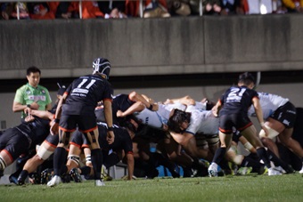 7分にはラインアウトからのモールでインゴールの侵入を許したが、嶋田らが身を挺してグラウンディングは防いだ。「いい我慢ができた」と嶋田。19分には敵陣深く攻め込み、パスが一瞬乱れ、こぼれたボールをダグラスが拾い、インゴール右中間に滑り込んだ。田村が再びコンバージョンキックを成功し、14点をリードする。