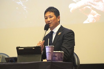 では、なぜレイドローHCなのか。内山ゼネラルディレクターはスクリーンに資料を映し出しながら、今季の強化テーマと、チーム強化に必要な三原則を説明した。強化、普及、キャリア支援。内山ゼネラルディレクターは「この三原則をドライブかけたいと考えた時に彼がピッタリはまった」と言う。