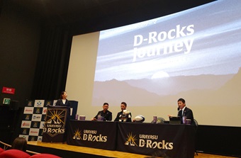 映画館での会見ということもあってか主役はポップコーンとドリンクを持って登場した。スクリーンの前に設けられたステージにレイドロー新HC、鈴木啓太ジョシュア通訳、内山浩文ゼネラルディレクターの3人が上がった。イクスピアリが浦安DRとパートナーシップを結ぶオリエンタルランドが運営する商業施設ということで、この“浦安D-Rocks劇場”が実現したと言えよう。