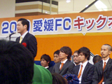 1月23日(土)、愛媛県伊予郡松前町にある巨大ショッピングモール「エミフルMASAKI」内グリーンコートにて開催された「2010シーズン愛媛FCキックオフフェスタ」。新シーズンの到来を告げる、このイベントでは、前回お伝えした新加入選手のお披露目、各選手の背番号発表の他にも、2010シーズンのチーム・スローガンや新ユニフォームの発表なども行われた。(写真:松山市・中村時広市長(左)も選手たちを激励)