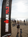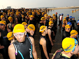 トライアスロンは大きく分けて2つの競技距離がある。まずオリンピックで採用されているスイム1.5km、バイク40km、ランニング10kmという距離で開催されるオリンピックディスタンス。このレースは速い選手で2時間弱、一般の選手でも3時間から4時間程度で完走することが出来るので開催数も多く、世界で開催されている大会の8割程がこの距離だと言われている。もう一方、スイム3.8km、バイク180km、ランニング42kmと長い距離で開催されているのがロングディスタンス。その世界的シリーズが「アイアンマン」という事になる。「アイアンマン」は世界中で開催されており、このシリーズの頂点がハワイアイアンマンとして、世界中のトライアスリートの憧れだ。そのアイアンマンシーリーズの半分の距離、スイム1.9km、バイク90km、ラン21kmで開催されるのが合計70.3mile(112.9km)の70.3シリーズ。このシリーズが現在世界中で爆発的な人気を呼んでおり、このうちの1戦が今回開催されたのである。(写真:1100人の選手で盛り上がる)