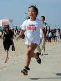 そんなこんなでようやくたどり着いた開催。これも神様が応援してくれたのか、この時期では最高のコンディションというくらい静かな海と、気持のよい晴天に恵まれた。市民ボランティアも予想以上にたくさん集まっていただき1300人を動員した。なんと人口の3%近くが手伝いに来てくれた計算になり、準備したTシャツが足りなくなるという嬉しい悲鳴を上げる事態となった。医療班50名、スイムレスキュー100人、警備員600人、警察官180人という大勢の方々の協力とサポートの中1100人のトライアスリートが熱いレースを繰り広げた。(写真:前日にはキッズの大会も開催され盛り上がった)