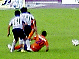 (写真:両チーム、激しい接触プレー)