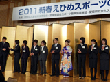 愛媛県体育協会などが主催する「新春えひめスポーツのつどい2011」が3日、松山市内のホテルで開かれた。集まったのはボートの武田大作選手やダイキ弓道部員など、県内のアスリートやスポーツ関係者など約230名。今回は司会をビーチバレーの佐伯美香さんが務め、なぎなたの全日本選手権で史上最多となる7度の優勝経験を誇る池見敬子選手、昨年9月の世界柔道で金メダルを獲得した浅見八瑠奈選手がいずれも和服姿でトークショーに登場し、会は華やかムードに包まれた。出席者はお互いの親睦を深めつつ、新たな年のさらなる飛躍を誓っていた。(写真:各競技のトップクラスの選手たちが大勢集まった)